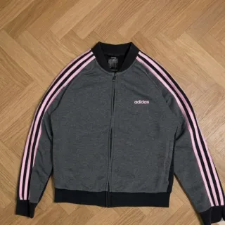 Sudadera deportiva con un diseño clásico y detalles llamativos. - Tres rayas rosas en las mangas. - Logo de Adidas en color rosa en el pecho. - Cremallera frontal completa. - Cuello alto acanalado. Talla 140 edad 9-10años