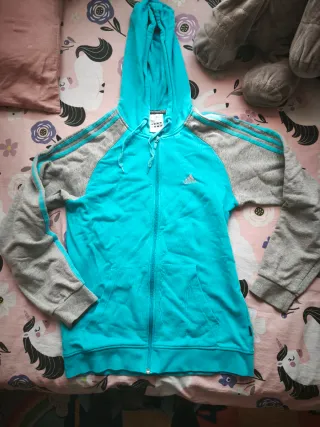 Sudadera original Adidas talla S pero grande, es como una talla M/L. Tiene un color azul precioso!!!! Perfecto estado