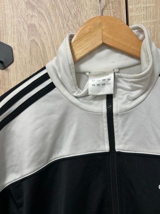 Sudadera con cremallera completa y capucha. - Diseño bicolor en negro y blanco. - Bolsillos delanteros. - Logo de Adidas en el pecho. - Rayas deportivas en las mangas. - En perfecto estado, con un par de manchitas en tono amarillo muy leves y sutiles (ver fotos) en la parte de atrás, que imagino que con un lavado sale.