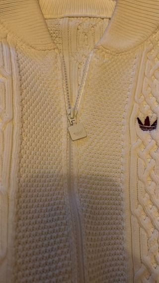 Cárdigan de punto trenzado con detalles de rayas color burdeos en las mangas. - Cuello alto. - Cierre de cremallera. - Logo de Adidas bordado.