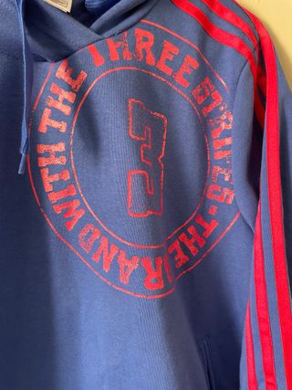 Sudadera con capucha de Adidas en color azul. Presenta el logo de la marca en grande en la parte frontal y las icónicas tres rayas en las mangas. - Capucha con cordones. - Bolsillo canguro. - Puños y bajo elásticos. - Tiene bordados a mano por un arreglo en las mangas
