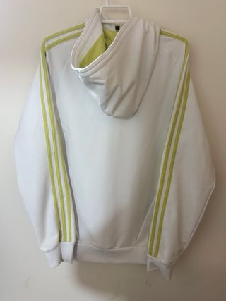 Sudadera Adidas original con cremallera completa y capucha. Color blanco con detalles en verde lima (rayas en mangas y cremallera). Logo bordado en el pecho. Talla S Medidas: • 65 cm de largo • 49 cm de axila a axila Muy buen estado, sin manchas ni roturas. Ideal para deporte o uso diario.