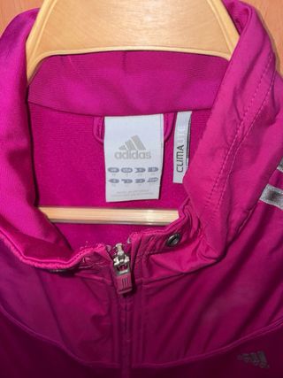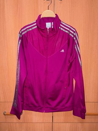 Sudadera deportiva Adidas en color fucsia con detalles plateados. - Cierre completo con cremallera. - Bolsillos laterales. - Rayas icónicas de Adidas en las mangas.