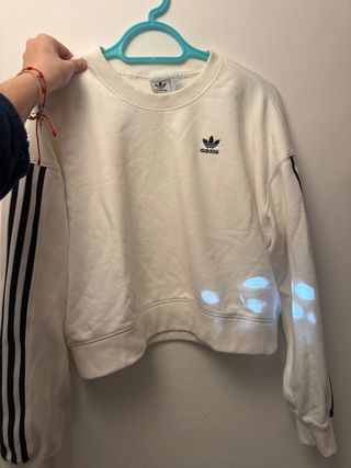 Sudadera Adidas de color blanco, con un diseño moderno y detalles icónicos de la marca. - Logo de Adidas en el pecho. - Tres rayas características en las mangas. - Corte cropped.