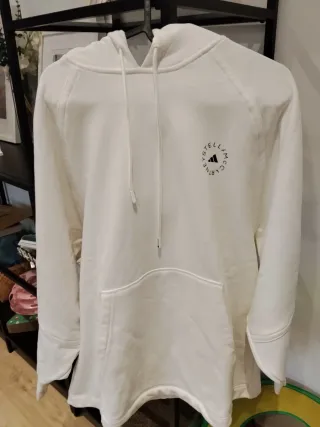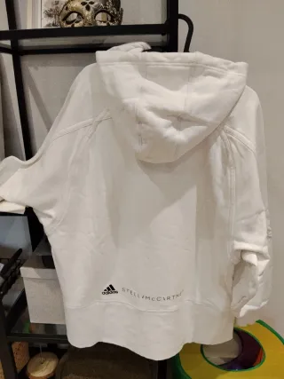 Sudadera con capucha de Adidas x Stella McCartney. - Diseño en color blanco con costura azul en las mangas - Logo circular de Adidas x Stella McCartney en el pecho y abajo en la espalda