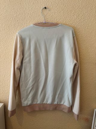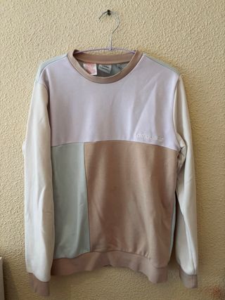 Sudadera Adidas con un diseño moderno de bloques de color. - Paneles en tonos beige, rosa pálido y blanco roto. - Logo de Adidas bordado en el pecho. - Cuello redondo y puños elásticos.