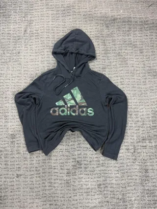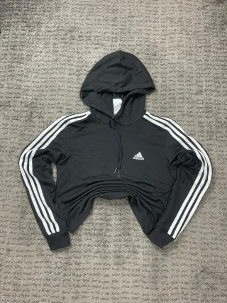 Sudadera corta de Adidas con un diseño moderno y juvenil. Perfecta para un look casual. - Logo grande de Adidas en el pecho. - Capucha con cordones ajustables. - Mangas largas. - Corte cropped.