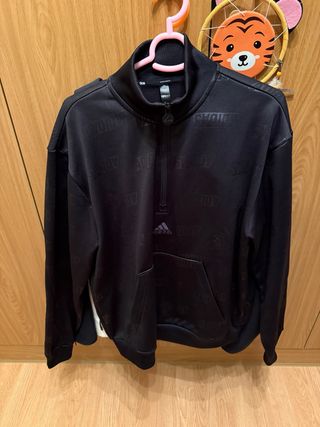 Sudadera Adidas con un diseño moderno y cómodo. - Color negro con estampado integral. - Cuello alto con media cremallera. - Bolsillo tipo canguro.
