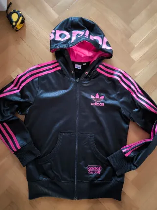 Sudadera vintage con un diseño llamativo y detalles deportivos. - Cremallera frontal completa. - Capucha con cordones. - Bolsillos laterales. - Rayas icónicas en las mangas. - Logo de Adidas en el pecho y detalle 'Chile 62'.