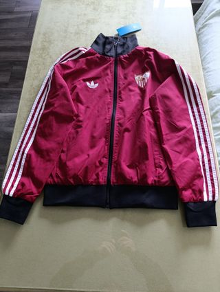 Sudadera deportiva del Sevilla FC con el icónico diseño de Adidas. - Color principal burdeos. - Detalles de rayas blancas en las mangas. - Cuello y puños en contraste negro y gris.