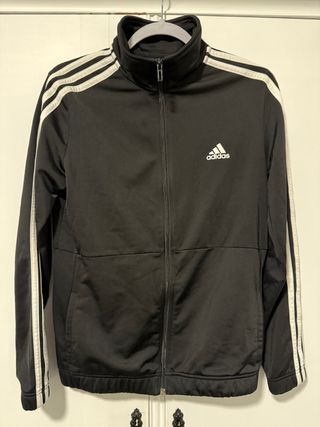 Sudadera deportiva clásica de Adidas. Talla 36 de niños. - Diseño con las icónicas tres rayas en las mangas. - Logo de Adidas en el pecho. - Cremallera frontal completa. - Bolsillos laterales con cremallera