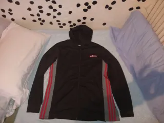 Sudadera con un diseño llamativo en tonos negros y rojos. Lo vendo por que a mi hijo le queda pequeño talla M - Mangas largas con las icónicas tres rayas rojas. - Escudo de España en el pecho. - Logo de Adidas en el pecho.