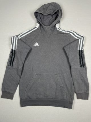 Sudadera con capucha de Adidas. - Diseño en color gris con detalles en negro. - Logo de Adidas en el pecho. - Cordones negros para ajustar la capucha.
