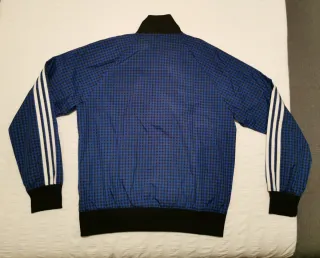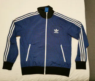 Sudadera Adidas original con cuello alto elástico y cremallera. Talla L. En perfecto estado. Prácticamente nueva. - Diseño a cuadros en azul y negro. - Cierre completo con cremallera. - Puños y cintura elásticos. - Bolsillos laterales con cremallera.