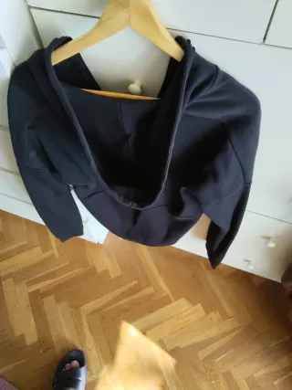 Sudadera Negra sin capucha y con cremallera delante. Es ajustada. Marca talla L pero es mas una M.