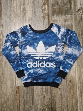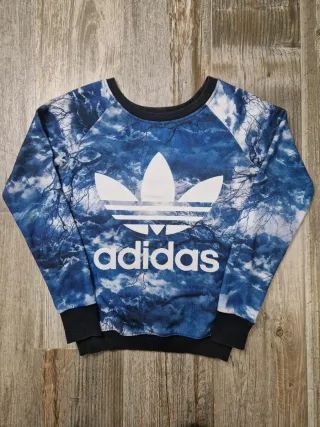 Sudadera con un diseño llamativo y moderno. - Estampado de nubes y ramas en tonos azules y blancos. - Logo de Adidas en grande en el pecho. - Puños y cuello de canalé negro.