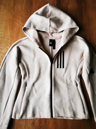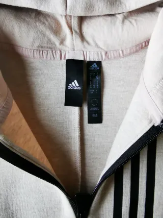 Sudadera Adidas de color beige con cremallera completa y capucha. - Diseño con las tres rayas icónicas de Adidas en negro en el pecho. - Bolsillos laterales con cremallera. - Puños y dobladillo elásticos.