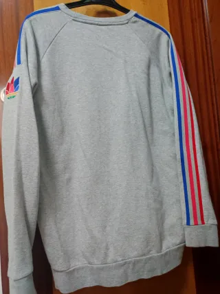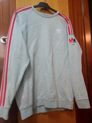 Sudadera Adidas gris de manga larga. Está en buen estado, aunque presenta algunas marcas de uso. - Modelo clásico con tres rayas blancas en las mangas. - Logo de Adidas bordado en el pecho. - Tejido suave y cómodo.