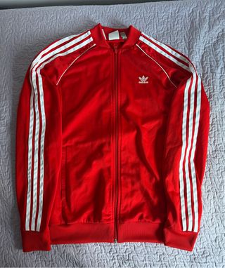 Chaqueta deportiva Adidas con tecnología Climalite. Pone talla S pero en realidad es una M. Compradas por mi familia, siempre muy cuidadas y limpias. - Diseño en color rojo con detalles en negro. - Logo de Adidas en blanco. - Rayas deportivas en los laterales. - Forro interior - Cintura adaptable - cremallera en el forro