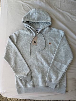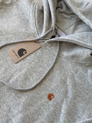 Sudadera Carhartt de color gris, nueva y sin etiqueta. Presenta un diseño moderno y cómodo. - Logo de la marca en la manga. - Bolsillo frontal tipo canguro. - Capucha ajustable con cordones.