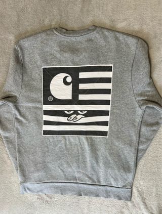 Sudadera Carhartt de color gris con un diseño gráfico en la espalda. - Diseño de bandera con logo Carhartt. En perfecto estado - Cuello redondo.