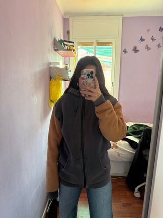 Sudadera azul marino, marca " DC", con capucha naranja, bolsillo central para ámbas manos y cremallera pequeña no se abre totalmente. La sudadera se pone por la cabeza. En etiqueta pone talla (XL) 16 años. NO TENGO BIZUM.
