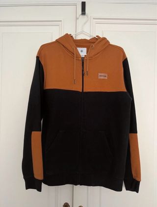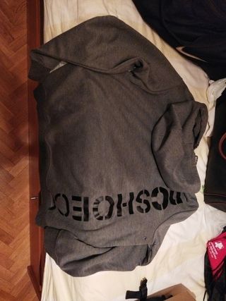 Sudadera con capucha de la marca DC Talla L, ajustada. Repelente al agua. Pensaba para practicar deportes de nieve. Muy caliente, por dentro lleva como pelillo para dar calor. Bolsillo central. Tiene ventilación bajo las axilas.