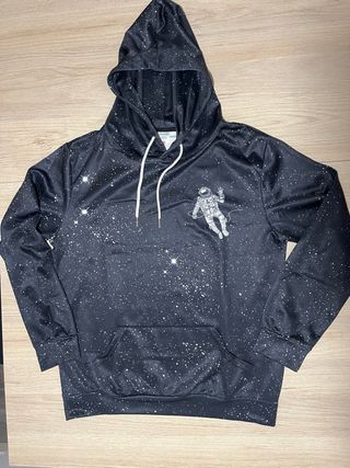 Sudadera con estampado de galaxia y astronauta. Diseño unisex. - Estampado integral de estrellas y nebulosas. - Figura de astronauta flotando. - Capucha con cordones. - Bolsillo frontal tipo canguro.