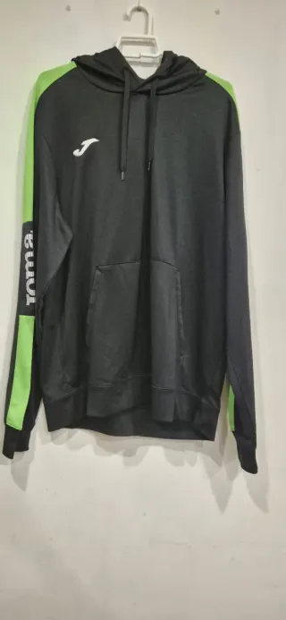 Sudadera con capucha de la marca Joma, combinando los colores negro y verde. - Diseño con capucha y cordones. - Bolsillo frontal tipo canguro. - Detalle de color verde en las mangas. -Tela para mantenerse caliente -Cualquier duda al privado