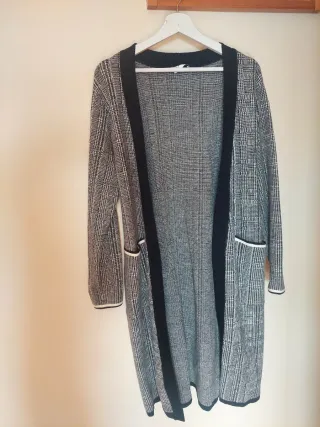 Chaqueta de punto larga de la marca Javier Simorra. - Diseño de cuadros en tonos grises y negros. - Abertura frontal. - Bolsillos con ribete blanco.