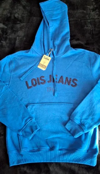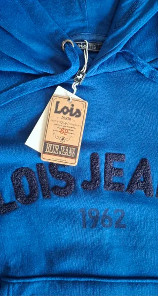 Sudadera con capucha de la marca Lois, modelo Blue Jeans. - Color azul vibrante. - Detalle de logo Lois en relieve en el pecho. - Número 62 bordado. - Estampado 1962 en la parte inferior.