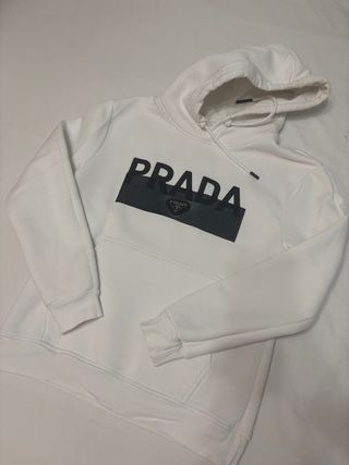 Preciosa sudadera con capucha de la marca Prada. Es de color blanco y tiene un logo de la marca en el pecho. - Talla: (Añadir talla) - Material: (Añadir material) - Estado: (Añadir estado)
