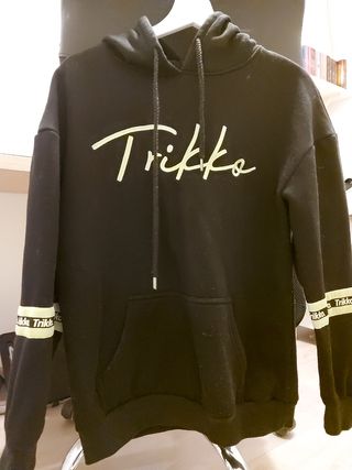 Sudadera negra en muy buen estado, usada una vez. La sudadera es más grande y larga de la talla que marca