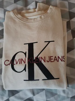 Sudadera de Calvin Klein Jeans en color beige. Presenta un diseño con el logo de la marca. Usada pero en buen estado. Tiene un manchita detrás de una manga que no he podido quitar. - Logo grande en la parte delantera. - Cuello redondo.