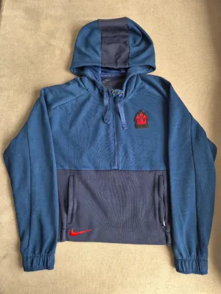 Sudadera con capucha del Atlético de Madrid para mujer. Diseño moderno y cómodo. - Media cremallera frontal. - Logo en el pecho. - Bolsillos laterales con cremallera. - Marca Nike. - Talla XS - En muy buen estado.