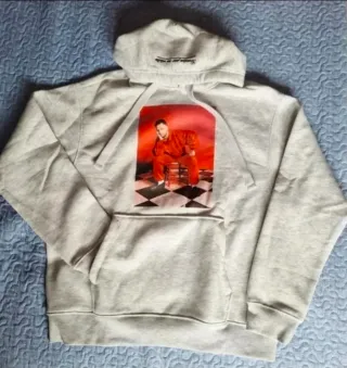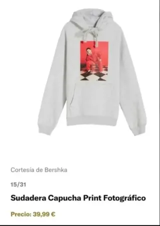 Sudadera con capucha de color gris, talla S, unisex. Es una prenda espaciosa y cómoda. - Diseño con una imagen estampada. - Capucha con cordón. - Tejido suave. Sudadera de color gris talla S, unisex, muy amplia coleccion C. Tangana para Bershka,con bolsillo delantero y capucha.Precio original 40 €. Solo se ha puesto una vez.