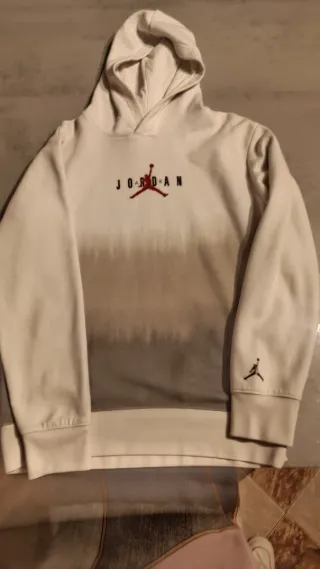 Sudadera con capucha original de la marca Jordan. Presenta un diseño degradado en tonos grises y blancos. - Logo de Jordan serigrafiado en el pecho. - Pequeño logo de Jordan en la manga. - Capucha con cordones. - Puños y bajo elásticos. -Talla XL niño (de 13 a 15 años, equivale a una S de adulto)