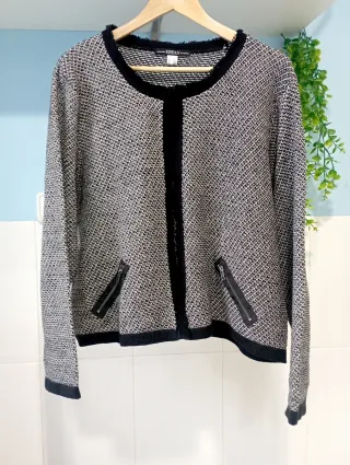 Cárdigan ó chaqueta de punto con un diseño texturizado y detalles modernos con rebetres en negro. - Cuello redondo con acabado deshilachado. - Cremalleras decorativas. Marca Urban by Venca, talla 3XL Como nueva