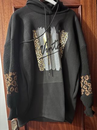 Atrevida y muy poco vista sudadera con capucha marca Top Star. Bolsillo delantero. Abrigada y calentita por dentro por tener franelilla y tacto fresco y sedoso por fuera. 80 % algodón y 20 % viscosa. Talla L. Unisex. Mide de sisa 53 cm, hombros 45 cm y largo 67 cm Está muy bien perfecta por el exterior, pocas puestas casi como nueva. No rebajo.