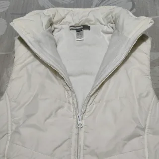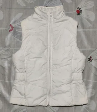 Chaleco acolchado de color blanco. Con dos bolsillos con cremallera. Cierre con cremallera. Forro polar interior. Talla 36 Mide 54 cm de largo, 34 cm de ancho de hombros y 88 cm de contorno de pecho. 100% poliéster y poliamida.