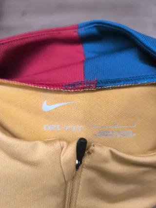 Sudadera de entrenamiento del FC Barcelona. - Diseño con cuello redondo y media cremallera. - Color dorado y mangas largas con detalles de color rojo/azul - Logo de Nike y escudo del club. - Patrocinio de Spotify. Usada solo en 2 ocasiones.