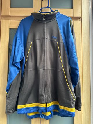 Sudadera deportiva Fila con un diseño moderno y detalles llamativos. - Talla XL (L EEUU) - Mangas y paneles laterales en azul. - Cuerpo principal en gris. - Ribetes amarillos en el cuello, puños y cintura. - Logo de Fila bordado en el pecho.