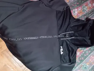 Sudadera de la marca Fila con un diseño moderno y llamativo. - Combinación de colores rojo y negro. - Detalle de logo Fila en el pecho. - Cinta con logo Fila en las mangas. *Buena calidad de la prenda;sin embargo, está para coser en las 2 ultimas imagenes, no es tan notable debido al ser negro*