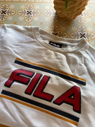 Sudadera estilo retro de la marca Fila, con un diseño vintage que evoca la moda de los años 90 y principios de los 2000. - Diseño frontal con logo Fila. - Combinación de colores blanco, rojo y detalles en azul y amarillo.