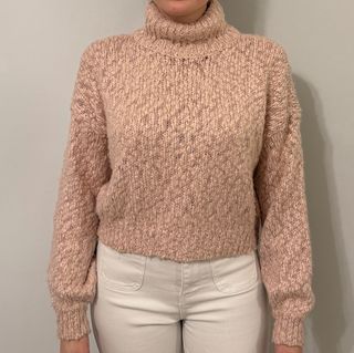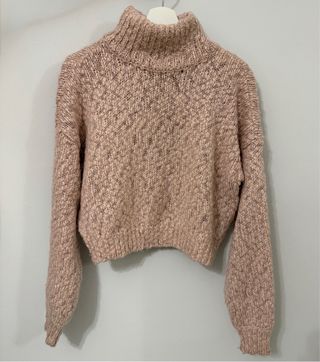Jersey de punto con cuello alto en color rosa. Tejido suave y cálido. En muy buen estado.
