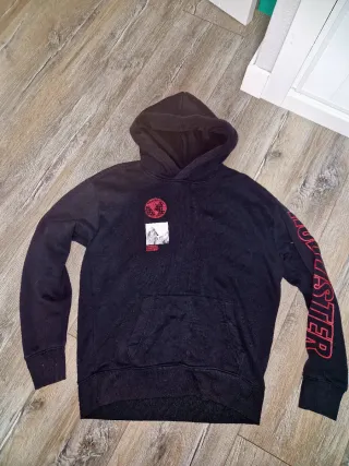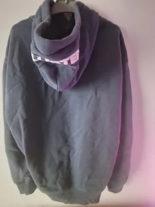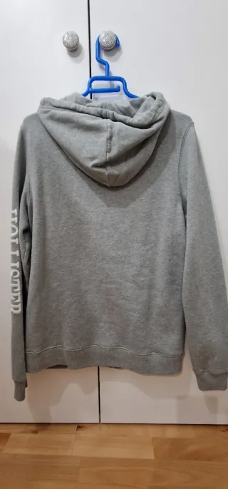 Sudadera con capucha, cremallera y bolsillos frontales. Es talla L, pero no es muy amplia, sería una M/L.