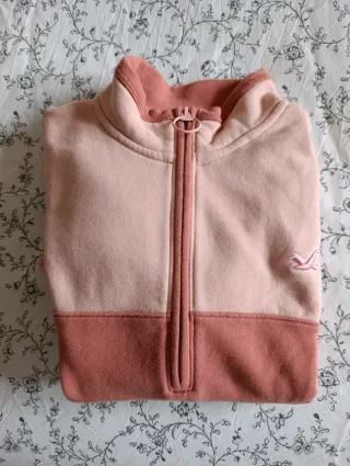 Sudadera corta de manga larga con media cremallera. - Diseño bicolor con franja central. El color está entre salmón y caldera, no es rosa. - Logo de Hollister bordado. - Cuello alto y puños elásticos. - Medidas: * Alto (sin contar el cuello): 47 cms * Ancho (de axila axila): 50 CMS * Largo manga (desde el extremo del cuello al puño): 74 CMS * Altura del cuello: 6 cms