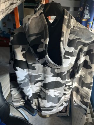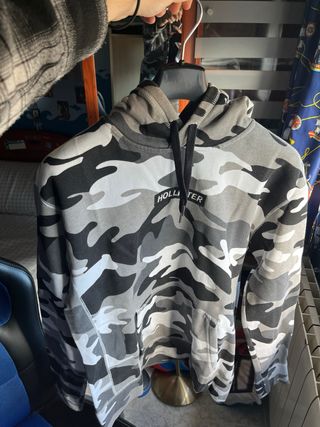 Sudadera con capucha y estampado de camuflaje. - Diseño de camuflaje en tonos grises y blancos. - Logo de Hollister en el pecho. - Ancho de hombros: 53cm - Largo: 66cm Urge venta, algo negociable.