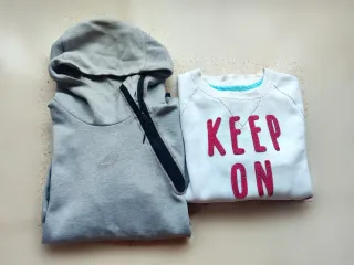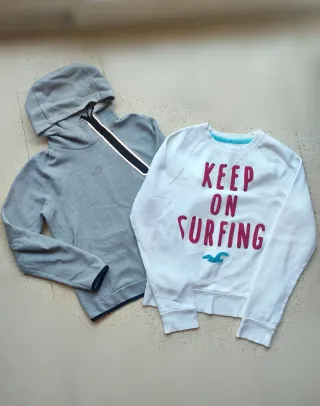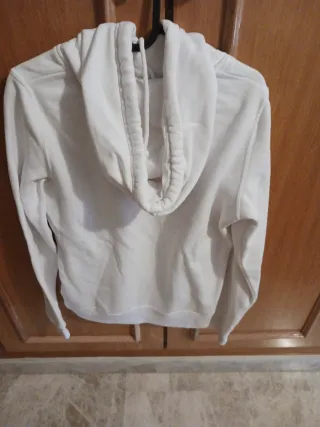 Lote de dos sudaderas talla S Sudadera gris Nike con capucha, talla XS pero yo la usé como S perfectamente, en perfecto estado Sudadera blanca Hollister en muy buen estado, tiene alguna letra un poco desgastada y una manchita en el final de una manga que imagino se quitará