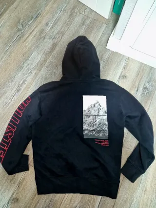 Sudadera con un diseño gráfico de montaña y atardecer en la parte delantera. - Estampado frontal con paisaje. - Capucha. - Bolsillo canguro. -venta en persona -pagos efectivo o PayPal